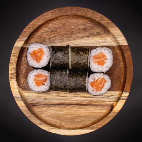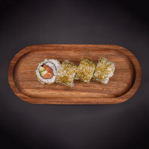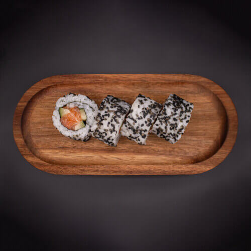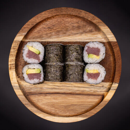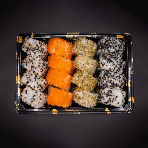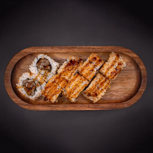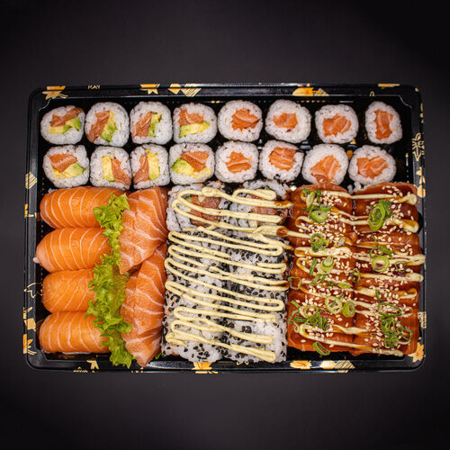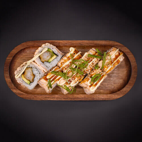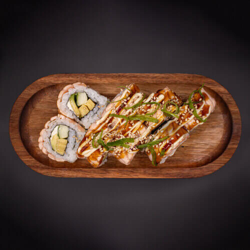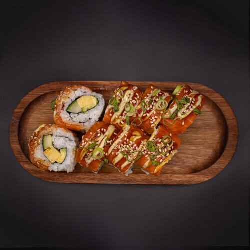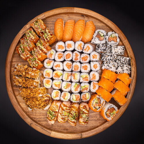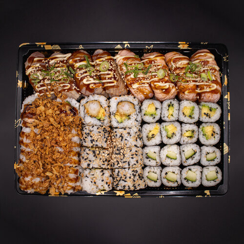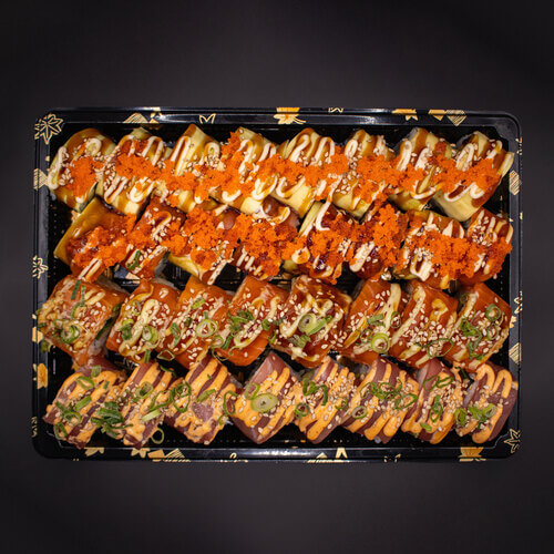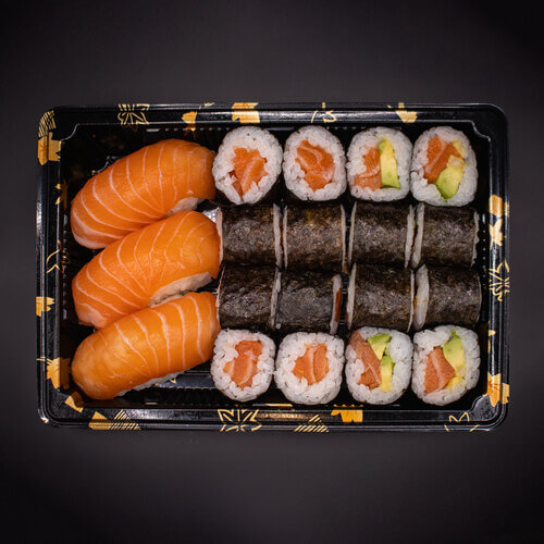 4 st. geflambeerde zalm nigiri, 4 st. geflambeerde tuna nigiri, 8 st. komkommer maki, 8 st. avocado maki, 8 st. ebi rol , 8 st. crunchy zalm rol