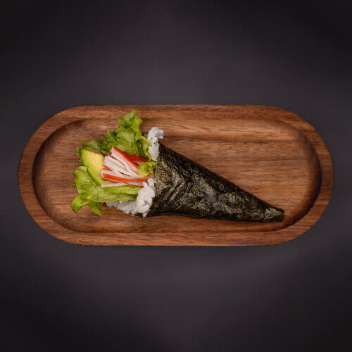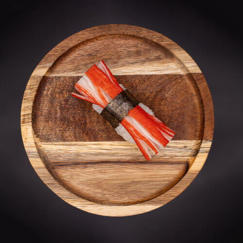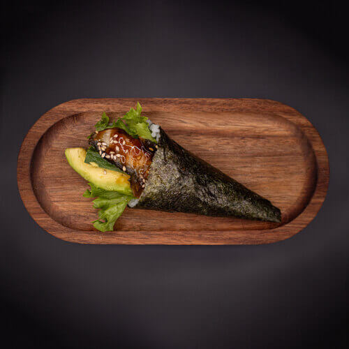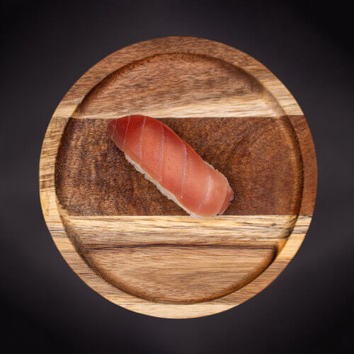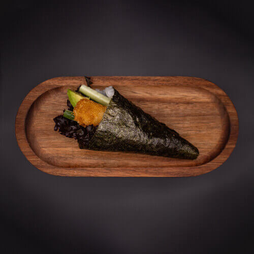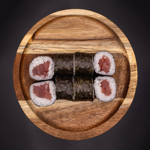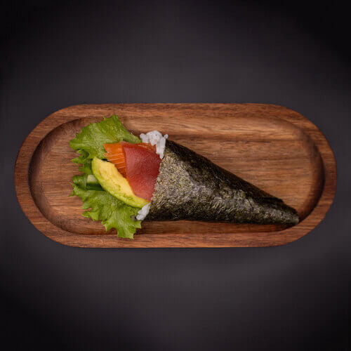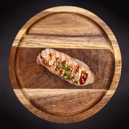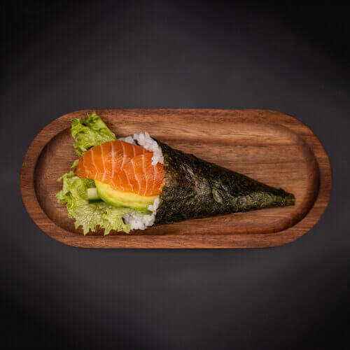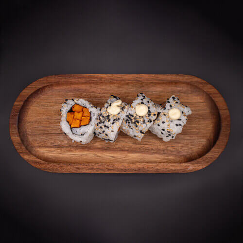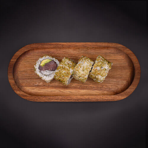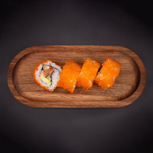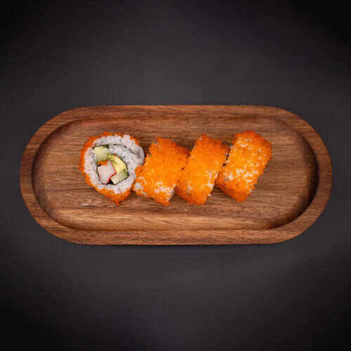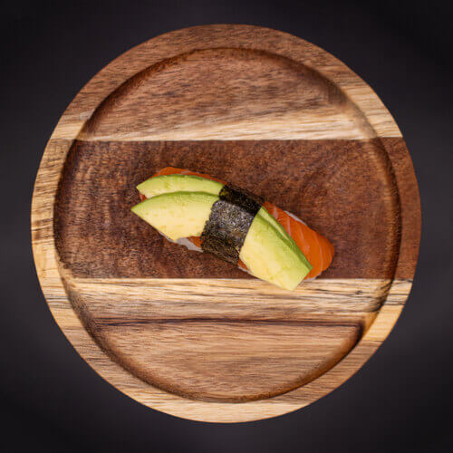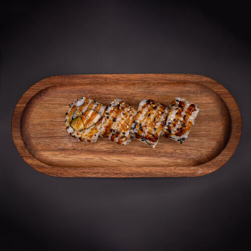 4 st. geflambeerde zalm nigiri, 4 st. geflambeerde tuna nigiri, 8 st. komkommer maki, 8 st. avocado maki, 8 st. ebi rol , 8 st. crunchy zalm rol
