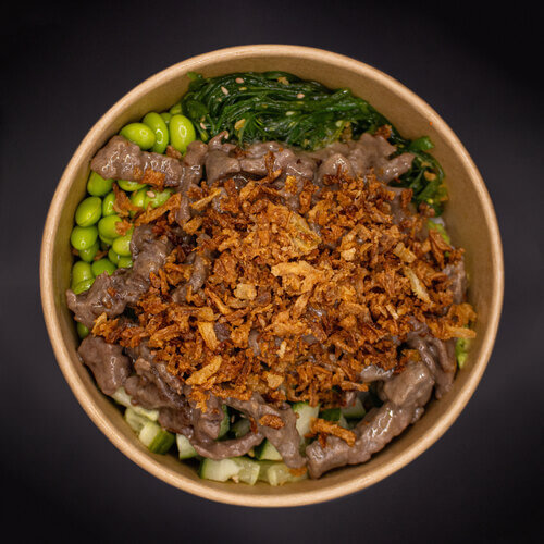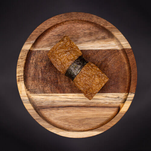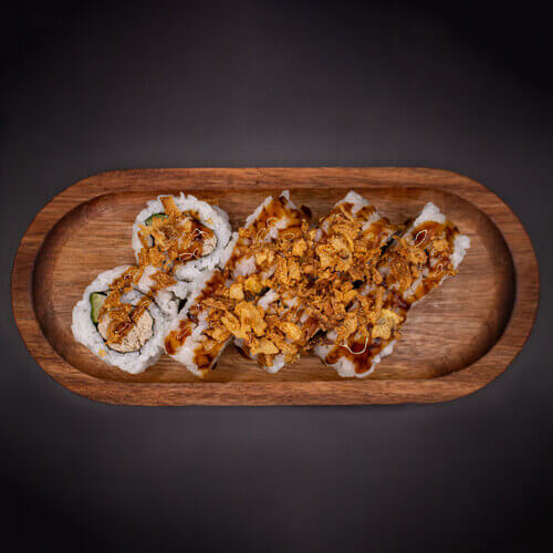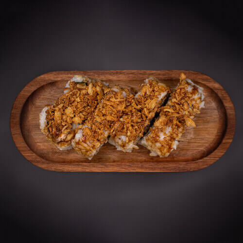 In gebakken uitjes,huisgemaakte beef(halal), op unagisaus, spicy pouder