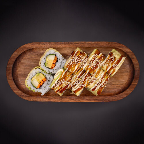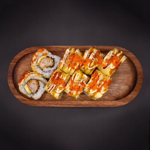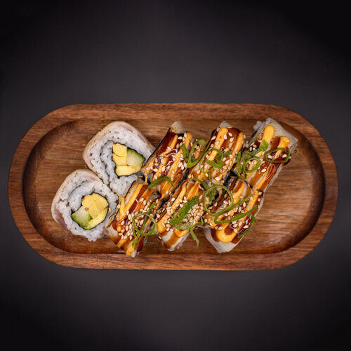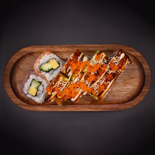 8 st. avocado ebi rol, 8 st. salmon dragon rol, 8 st. rainbow dragon rol, 8 st. tuna dragon rol