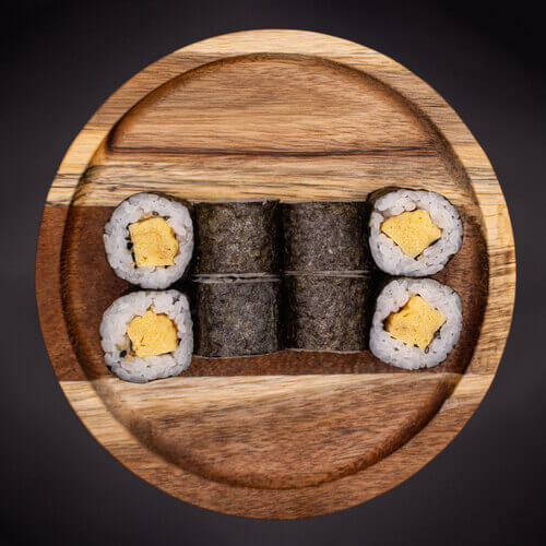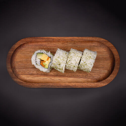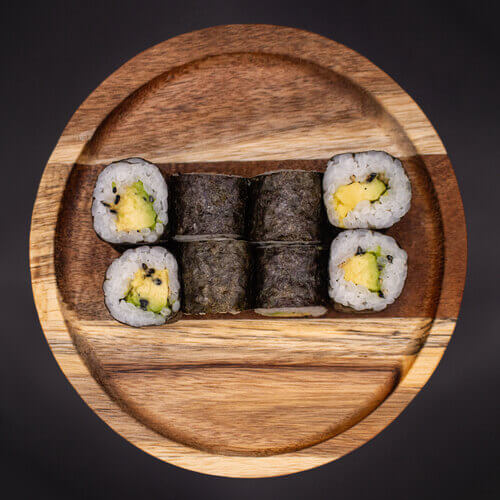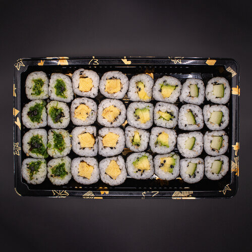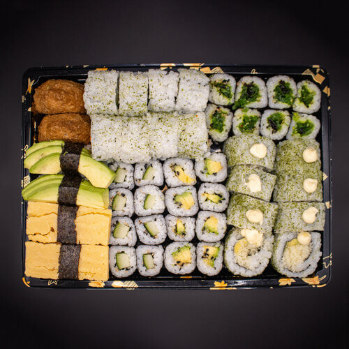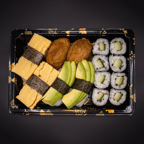 2 avocado nigiri, 2 tamago nigiri, 2 rofu nigiri, 8 st. komkommer maki