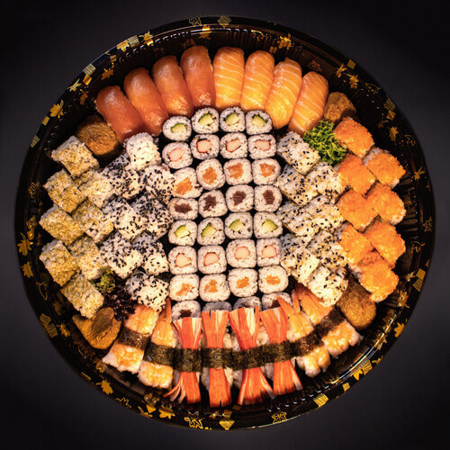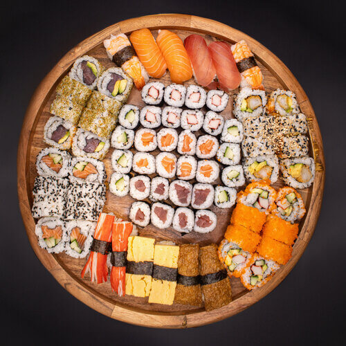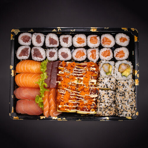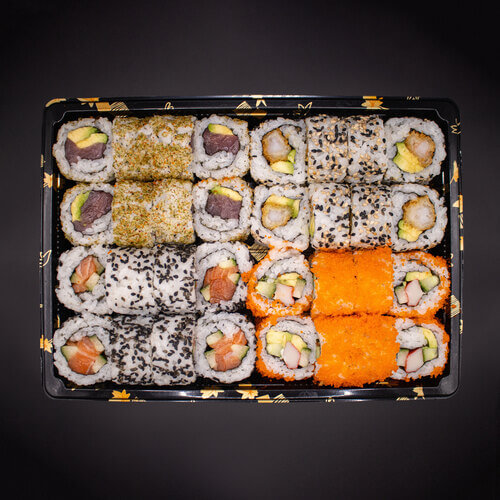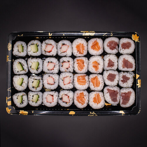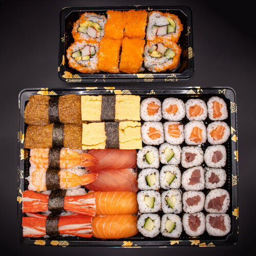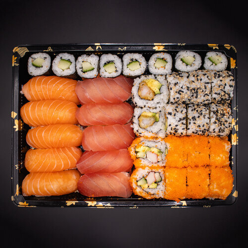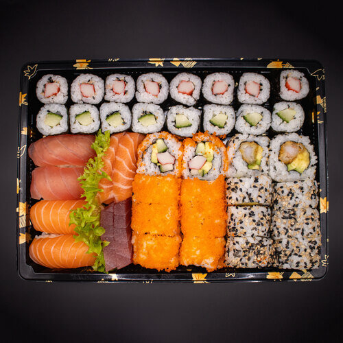 2 st. zalm nigiri, 2 st. tuna nigiri, 2 st. sashimi zalm, 2 st. sashimi tuna, 8 st. komkommer maki, 8 st. surimi maki, 8 st. ebi rol, 8 st. california rol