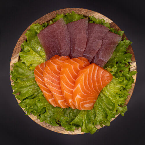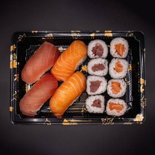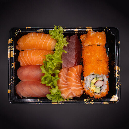 2 st. zalm nigiri, 2 st. tuna nigiri, 2 st. sashimi zalm, 2 st. sashimi tuna, 4 st. california rol