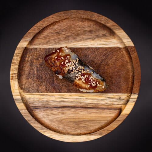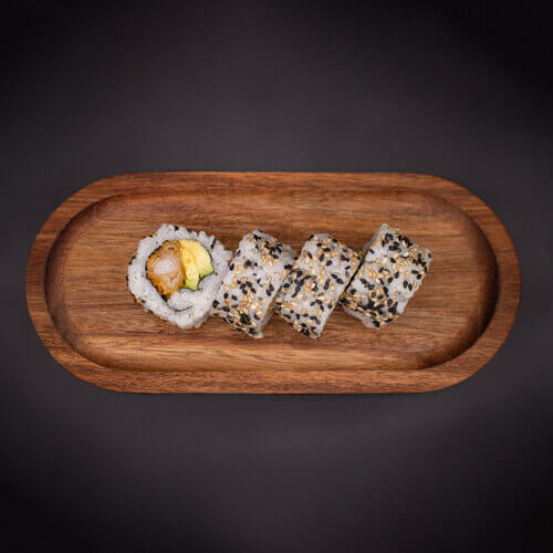 In avocado, gefrituurde garnaal, op gegrilde paling, unagisaus, sesamzaad