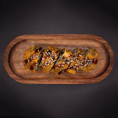 In avocado,gefrituurde garnaal, op avocado, Japanse mayonaise,unagi saus, masago, sesamzaad