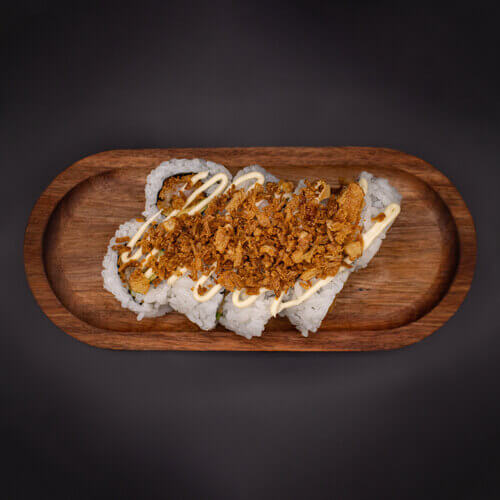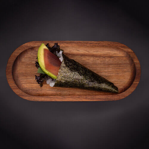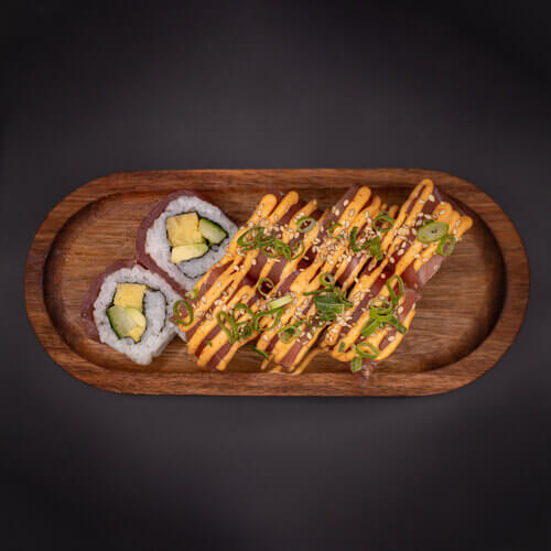 In avocado,komkommer,tamago, op tuna, spicy mayosaus, sesamzaad, bosui