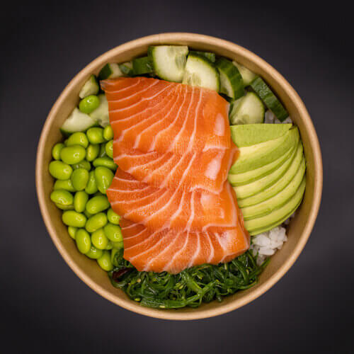 In avocado, komkommer, tamago, op zalm, Japanse mayo,unagisaus, bosui, sesamzaad