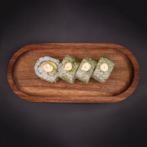 In roomkaas, komkommer, avocado, tamago, op tonijn, spicy mayo, sesamzaad, bosui